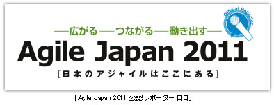 | その他 | ・応募者多数の場合、実行委員で選定を行います。 ・当選された方の、Agile Japan 2011 の参加料は発生しません。(懇親会は除く。) ・公認レポーターの方には、下記の「Agile Japan 2011 公認レポーター ロゴ」をお使いいただけます。